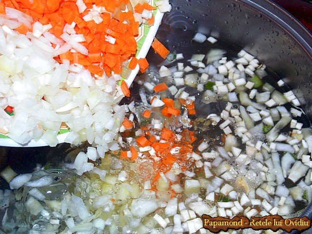 1. Tăiem cubuleţe mărunte toate legumele: ceapa, ardeiul, morcovi, păstârnacul, ţelina. Punem o oală cu apă pe foc şi adăugăm legumele tăiate.