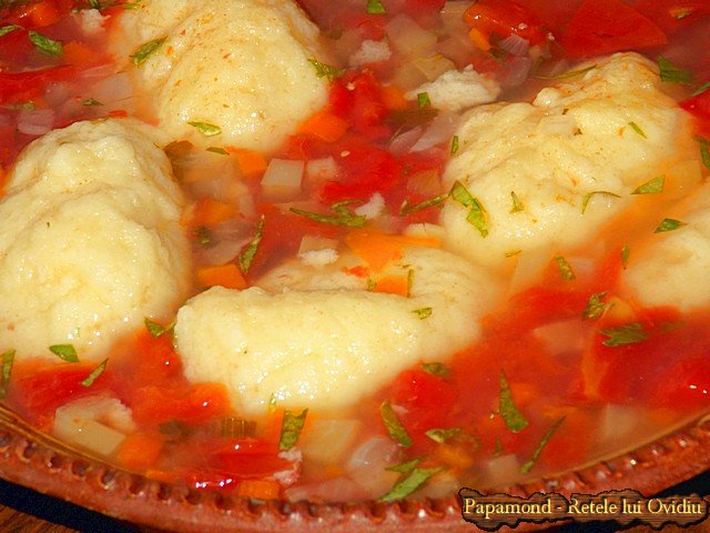 Gustoasă zeamă de vară, pe care eu aş încadra-o, după tradiţie şi chimie, mai degrabă la ciorbe decât la supe, supa de rosii este un soi de rezervă de sănătate. La ea te întorci, oarecum nostalgic, ca la o dragoste primară, după ce te-ai perindat prin diverse meniuri şi ghiftuit, ai concluzionat filosofic că: proteina nu aduce fericirea! Atunci, cu dor în glas, exprimi timid: parcă aş mânca o ciorba de rosii! Ritualul asta se repetă periodic şi face să te apropii de echilibrul – în speţa noastră, alimentar – sugerat de o veche şi înţeleaptă expresie: Nimic în exces! V-am spus, cu ceva timp în urmă, ce mare încântare trupească îţi oferă ciorba de roşii coapte pe grătar, mâncată cu pâine prăjită frecată cu usturoi, aşă că, azi vă îndemn la bucurie şi sănătate cu o supa de rosii cu galuste. Nu-i aşa că parcă aţi mânca o ciorbă de roşii?