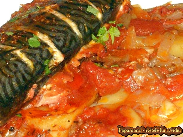 Având în vedere că nu v-am mai invitat la un peşte din vremea când puneam obleţi autohtoni pe orez, mă gândesc că a venit timpul să vă îndemn la un peşte mic, din oceanul Atlantic. Vom încerca şi cu siguranţă că vom şi reuşi să punem câteva macrouri, în tavă, pe ceva legume, sau mai bine zis, să preparăm macrou la cuptor. Sună puţin straniu pluralul asta de la macrou – macrouri. Am zis niscai legume pentru că nu am gândit o selecţie anume şi am optat pentru o baza simplă şi comodă de cartofi, îndulcită cu ceapă şi îmbujorată cu ardei gras roşu. Dacă vreţi mai sofisticată lucrarea şi dacă mai poftiţi şi la alte verzituri din piaţă, le puteţi face de-ncercare.