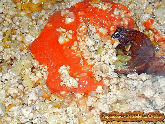 2. Tocăm mărunt ceapa și o călim într-o tigaie încinsă. Adăugăm carnea tocată, condimentăm cu piper și sare, și amestecăm să se omogenizeze. După ce călim 5-6 minute la foc potrivit, adăugăm bulionul și pătrunjelul tocat.