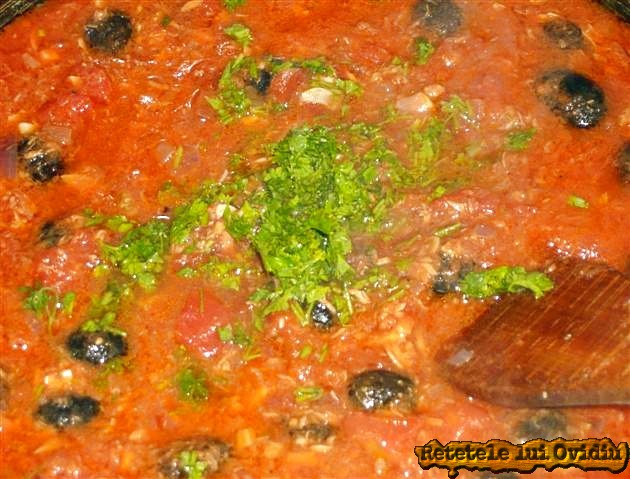 3. După câteva minute de bolborosit încet adăugăm măslinele.