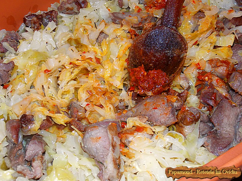 Tăiem pastrama de oaie în bucăţi nu prea mari, cât o îmbucătură. Curăţăm ceapa şi o mărunţim. Încingem untura într-o tigaie mai înaltă sau o cratiţă şi călim ceapa împreună cu pastrama de oaie tăiată. După ce s-au călit le scotem şi le punem într-un vas roman, de lut. Mărunţim varza murată şi o călim şi pe aceasta pentru 10 minute în untura rămasă, împreună cu o linguriţă de boia, câteva boabe de piper şi cimbru.