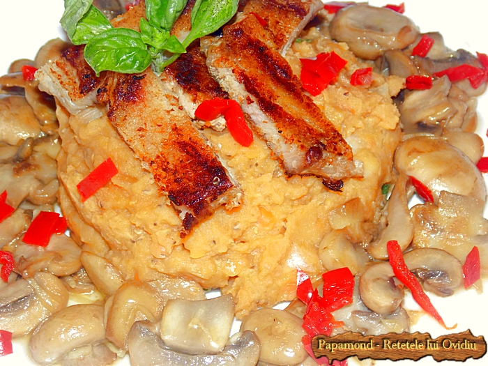 Montăm farfuria, după cum poate și se pricepe fiecare. Eu am pus piureul de linte roșie în mijloc, peste el pieptul de pui tăiat felii, și în jurul piureului am așezat ciupercile sote. Am presărat peste toate cubulețe de gogoșar acru. Puteți orna cu ceapă verde, mărar, etc. Piureul de linte roșie merge foarte bine și întins pe pâine, în caz că doriți să-l mâncați simplu, dar despre acest piure am să fac un articol separat, pentru că azi mâncăm piept de pui cu piure de linte.