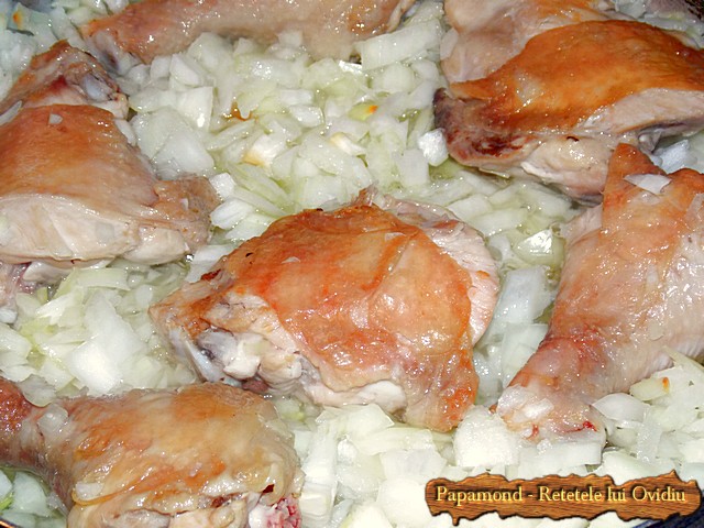 După ce rumenim pulpele pe ambele fețe, adăugăm ceapa tocată și lăsăm pe foc mic până ce devine ceapa transparentă.