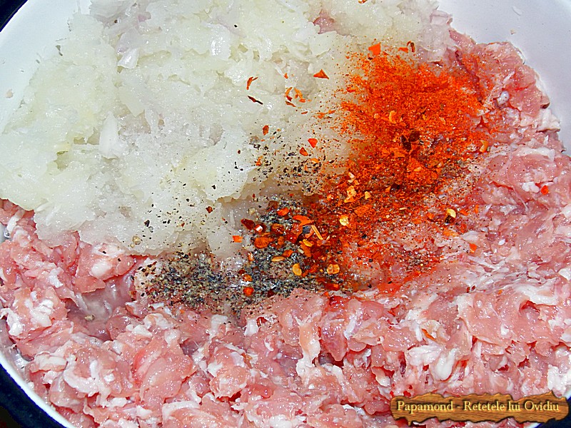 Preparăm compoziţia pentru chiftele. Eu am folosit carne tocată amestec porc-curcan dar puteţi folosi orice carne, porc, vită sau pasăre. Adăugăm la carnea tocată cele două cepe date pe răzătoare, piper măcinat, boia, sare şi pesmet. Amestecăm şi frământăm bine compozia de chiftele. Pesmetul are rolul de a lega bine chiftelele astfel încât acestea să nu se fărâmiţeze în urma gătirii la cuptor. Cu mâna umedă formăm chiftele, le turtim cu podul palmei astfel încât să aibă de aceeaşi mărime cu rondelele de vinete. Lăsăm chiftelele formate pe un platou.